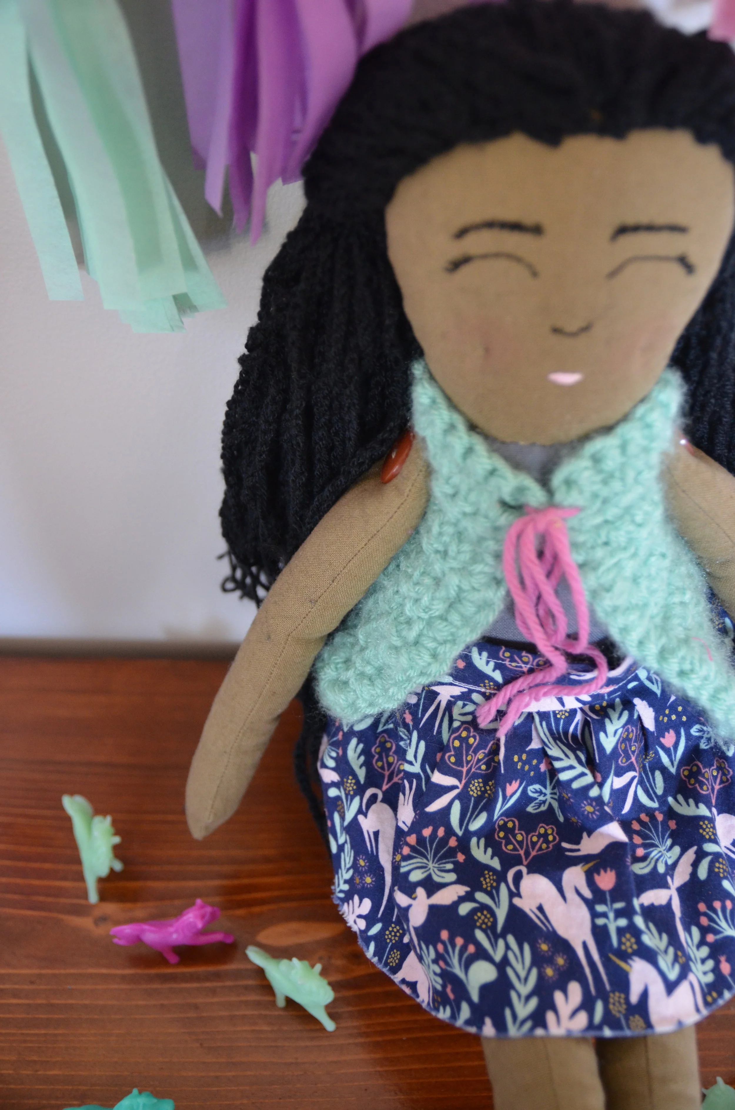 I had told Strange Folks Dolls about the unicorn party and she added in some super special unicorn fabric for the dolls skirt to go perfectly with our theme and colors!