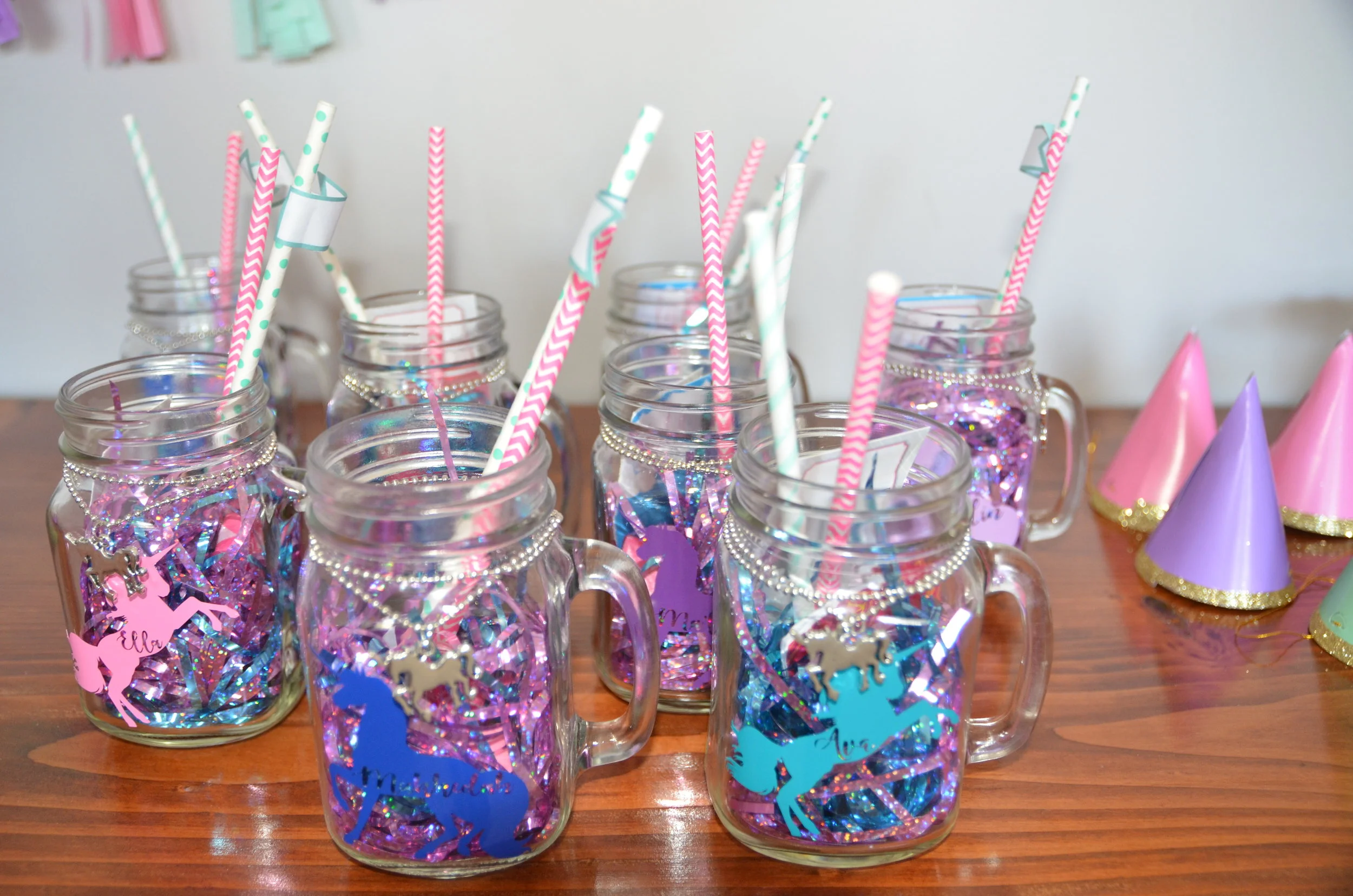 Each girl had a personalized mason jar glass to take home as their favor. I created custom unicorn stickers to apply to each cup. They were filled with colored streamers, candy and gum and matched our color scheme, a small notepad gift, colored paper straws and a silver unicorn necklace.