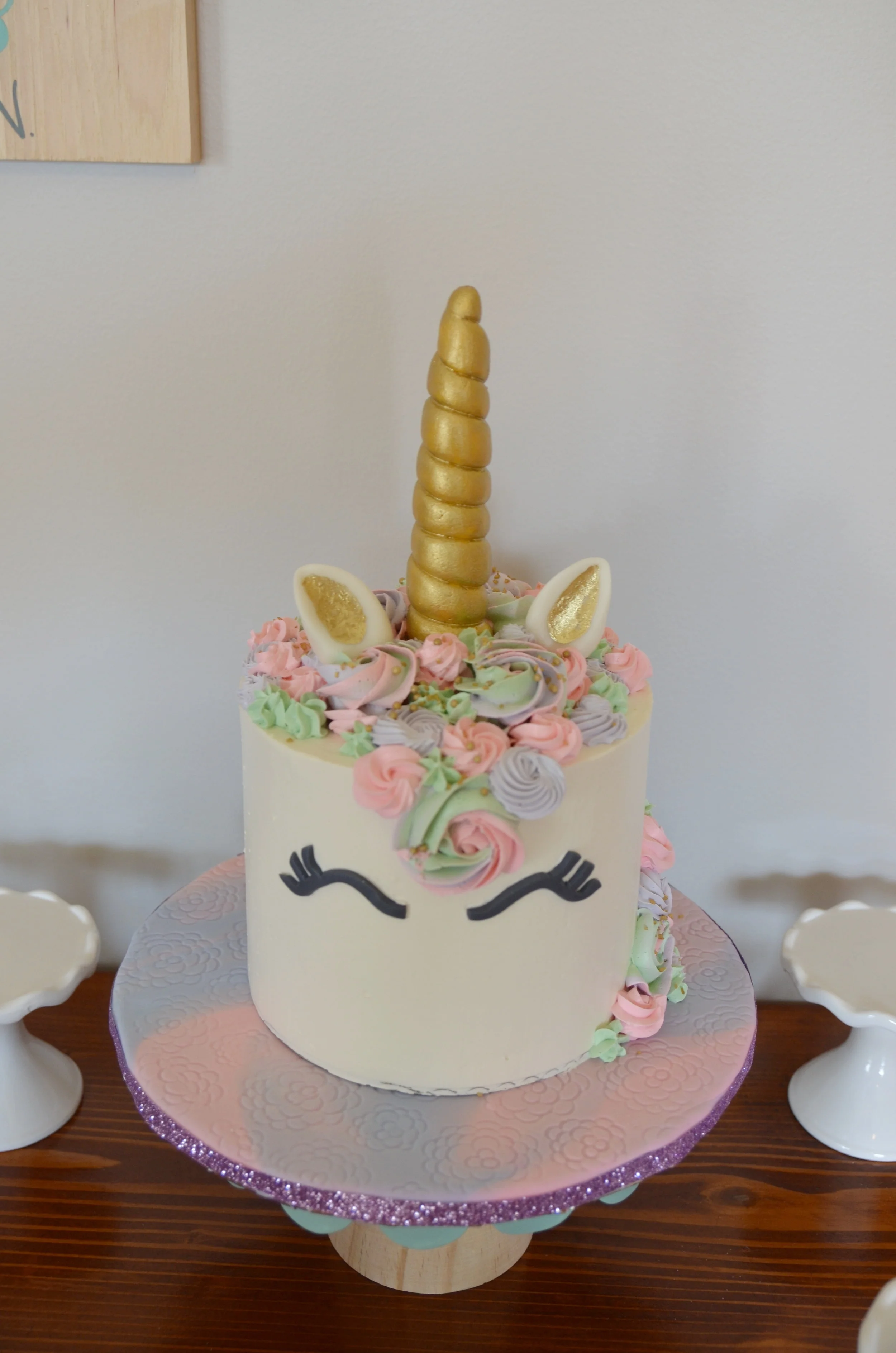 This drop dead gorgeous cake is from the amazing Gray Duck Bake Shop and Mary was an absolute joy to work with! I gave her my vision for the cake and our color scheme (of mint, light purple and pink) and let her run with her. I was shocked at how incredible this cake looked. I took ALL of my willpower to actually cut through the cake because it was so beautiful. It was a work of art that I just wanted to keep forever. But... I'm really glad we cut into it because it was freakin' delicious!!! And even the layers of the cake were colored to match our color scheme and everyone at the party was amazed at how pretty the inside was too- a neat little surprise as we cut the first piece. The girls fought over who got to eat the horn and ears but shared very well. There was literally not even ONE CRUMB left of this cake- it was so tasty!